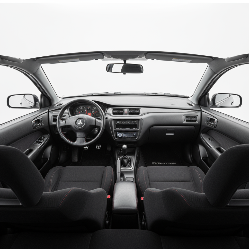 The design of the Lancer Evolution VII RS2 is a statement of intent. Its aggressive lines, imposing rear spoiler, and functional air intakes leave no doubt about its sporting purpose. The 17-inch wheels, shod with 235/45 R17 tires, fill the wheel arches and reinforce its rally car image. Although it is a four-door sedan, its aesthetics are completely performance-oriented, with a body that screams speed and efficiency. It is a design that, despite the years, remains recognizable and admired by enthusiasts.