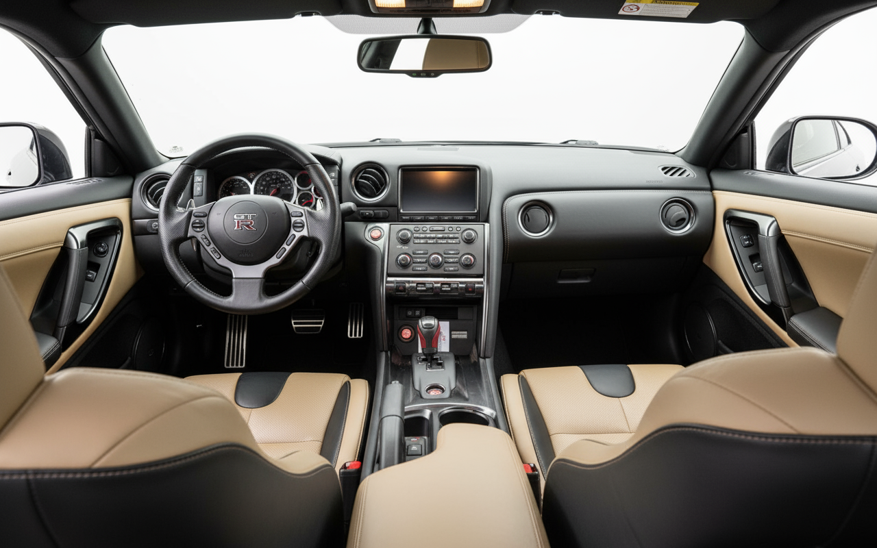 The Nissan GT-R is a showcase of automotive technology. Its 3,799 cc V6 engine, with indirect injection, turbo, and intercooler, is a masterpiece of engineering, delivering 549 HP at 6400 rpm and a torque of 632 Nm at 3200 rpm. The oil-bathed, six-speed dual-clutch automatic transmission ensures ultra-fast and smooth gear changes. The all-wheel drive (AWD) system intelligently distributes power to maximize grip in any situation. The 390 mm front and 380 mm rear ventilated disc brakes ensure exceptional braking capability, while the rack-and-pinion steering with electric and speed-sensitive assistance offers precise response. It's a car where every technological component is at the service of speed and control.